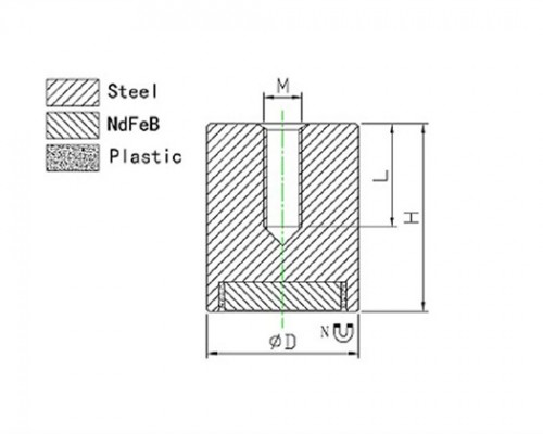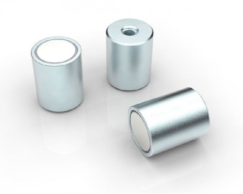 此款圆柱形强磁吸盘带有一个内螺纹孔,可与有外螺柱的物体装配使用。